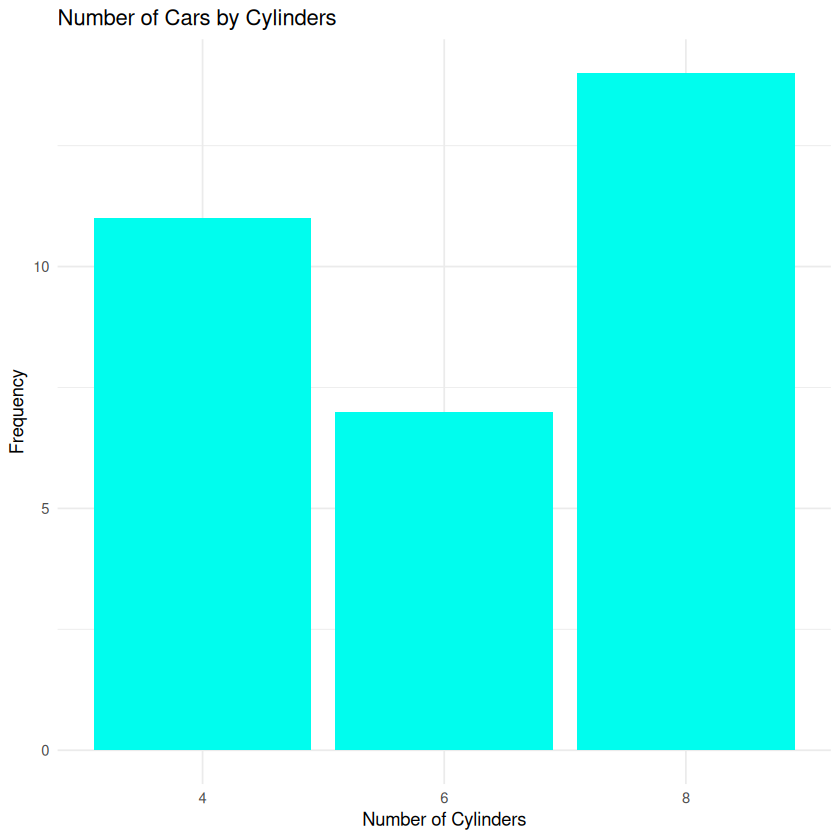 # Bar chart of the number of cars by cylinders using ggplot2ggplot(mtcars, aes(x =factor(cyl))) +geom_bar(fill ="#00fdee") +ggtitle("Number of Cars by Cylinders") +xlab("Number of Cylinders") +ylab("Frequency") +theme_minimal()