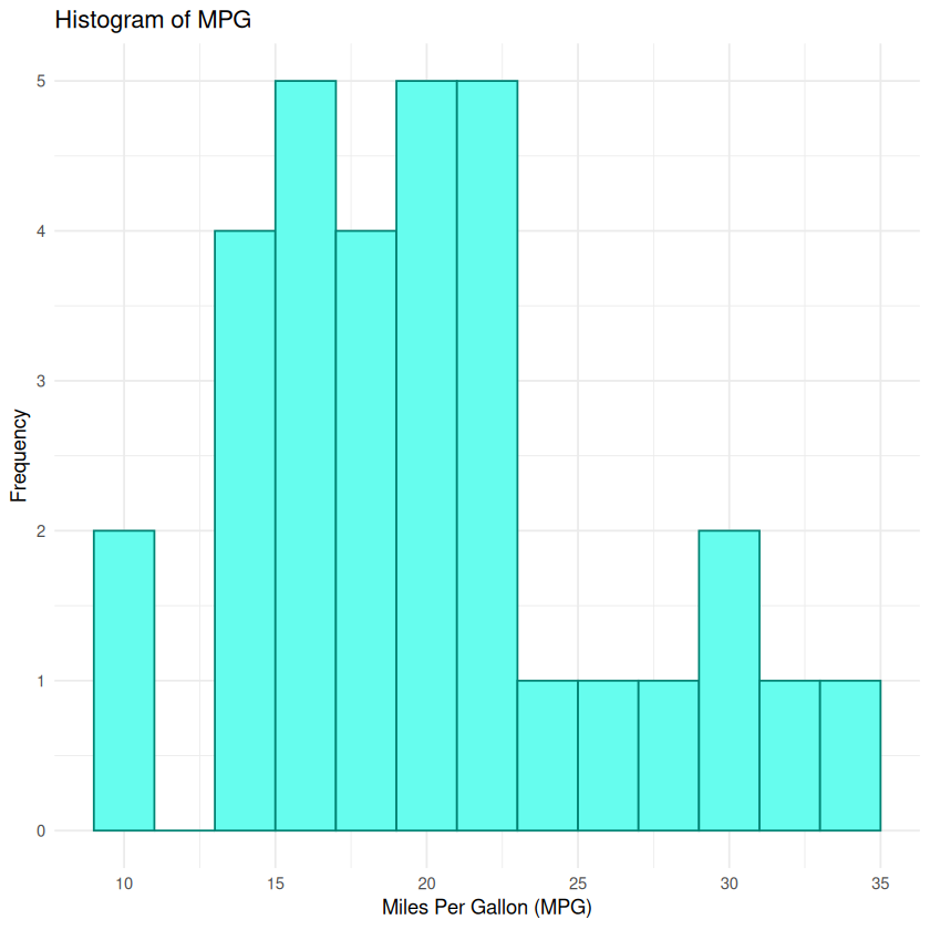 # Histogram of MPG using ggplot2ggplot(mtcars, aes(x = mpg)) +geom_histogram(binwidth =2, fill ="#66fdee", color ="#008374") +ggtitle("Histogram of MPG") +xlab("Miles Per Gallon (MPG)") +ylab("Frequency") +theme_minimal()