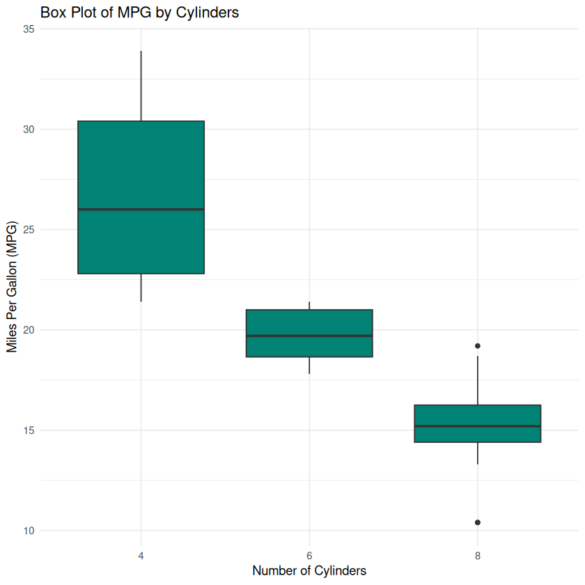 # Box plot of MPG by cylinders using ggplot2ggplot(mtcars, aes(x =factor(cyl), y = mpg)) +geom_boxplot(fill ="#008374") +ggtitle("Box Plot of MPG by Cylinders") +xlab("Number of Cylinders") +ylab("Miles Per Gallon (MPG)") +theme_minimal()