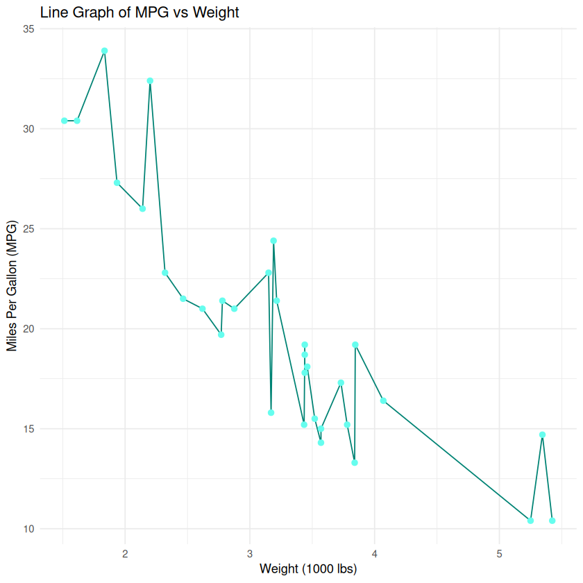 # Line graph of MPG vs Weight using ggplot2ggplot(mtcars_ordered, aes(x = wt, y = mpg)) +geom_line(color ="#008374") +geom_point(color ="#66fdee", size =2) +ggtitle("Line Graph of MPG vs Weight") +xlab("Weight (1000 lbs)") +ylab("Miles Per Gallon (MPG)") +theme_minimal()