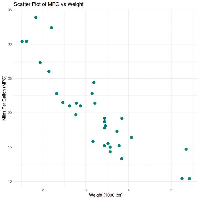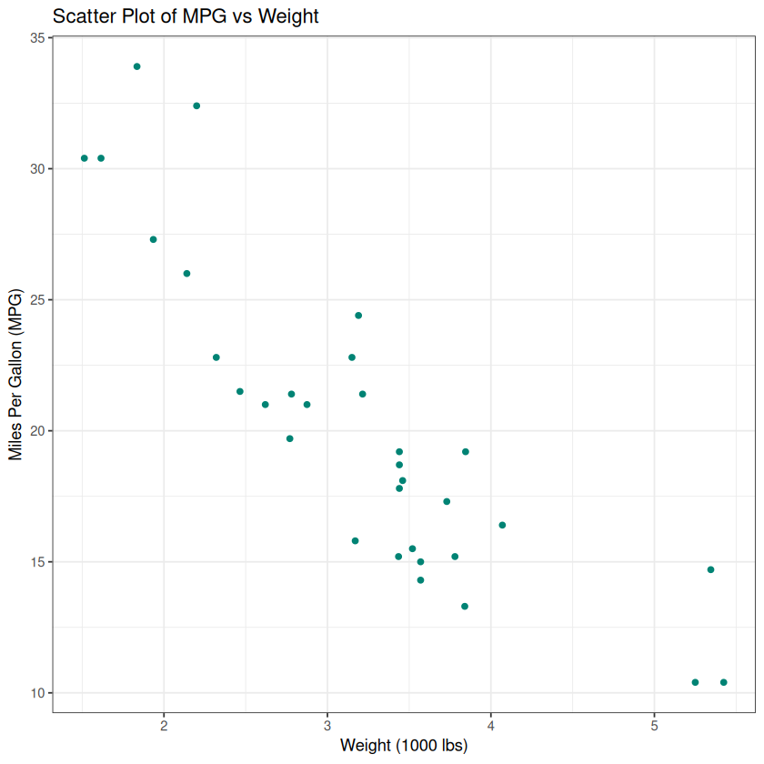 # Scatter plot of mpg vs wt using ggplot2ggplot(mtcars, aes(x = wt, y = mpg)) +geom_point(color ="#008374", size =3) +ggtitle("Scatter Plot of MPG vs Weight") +xlab("Weight (1000 lbs)") +ylab("Miles Per Gallon (MPG)") +theme_minimal()
