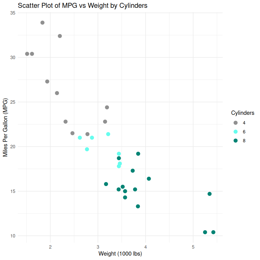 # Scatter plot with color based on number of cylindersggplot(mtcars, aes(x = wt, y = mpg, color =factor(cyl))) +geom_point(size=3) +ggtitle("Scatter Plot of MPG vs Weight by Cylinders") +xlab("Weight (1000 lbs)") +ylab("Miles Per Gallon (MPG)") +theme_minimal() +scale_color_manual(values =c("#909090", "#66fdee", "#008374"),name ="Cylinders")