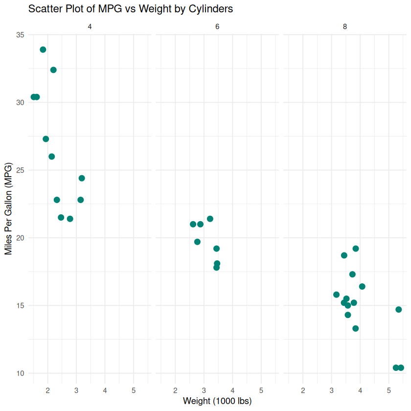 # Scatter plot faceted by number of cylindersggplot(mtcars, aes(x = wt, y = mpg)) +geom_point(color ="#008374", size=3) +ggtitle("Scatter Plot of MPG vs Weight by Cylinders") +xlab("Weight (1000 lbs)") +ylab("Miles Per Gallon (MPG)") +theme_minimal() +facet_wrap(~ cyl)