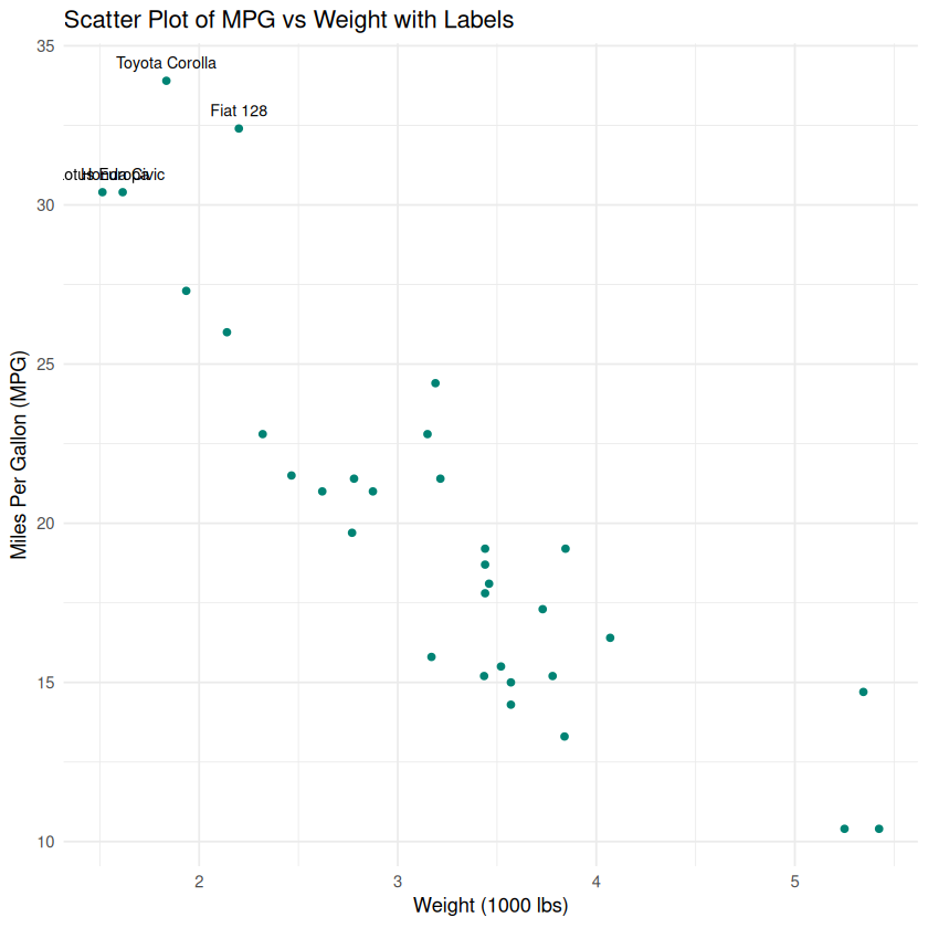 # Scatter plot with labels for cars with highest MPGtop_mpg <- mtcars[mtcars$mpg >30, ]ggplot(mtcars, aes(x = wt, y = mpg)) +geom_point(color ="#008374") +geom_text(data = top_mpg, aes(label =rownames(top_mpg)),vjust =-1, size =3) +ggtitle("Scatter Plot of MPG vs Weight with Labels") +xlab("Weight (1000 lbs)") +ylab("Miles Per Gallon (MPG)") +theme_minimal()