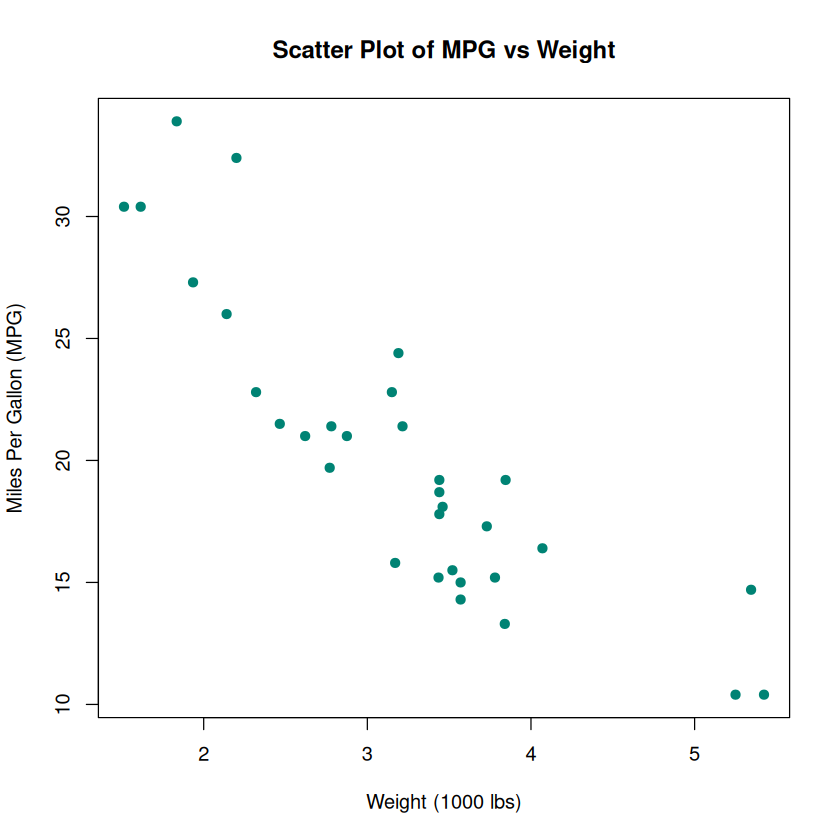 # Scatter plot of mpg vs. wtplot(mtcars$wt, mtcars$mpg,main ="Scatter Plot of MPG vs Weight",xlab ="Weight (1000 lbs)",ylab ="Miles Per Gallon (MPG)",pch =19, # Solid circlescol ="#008374")