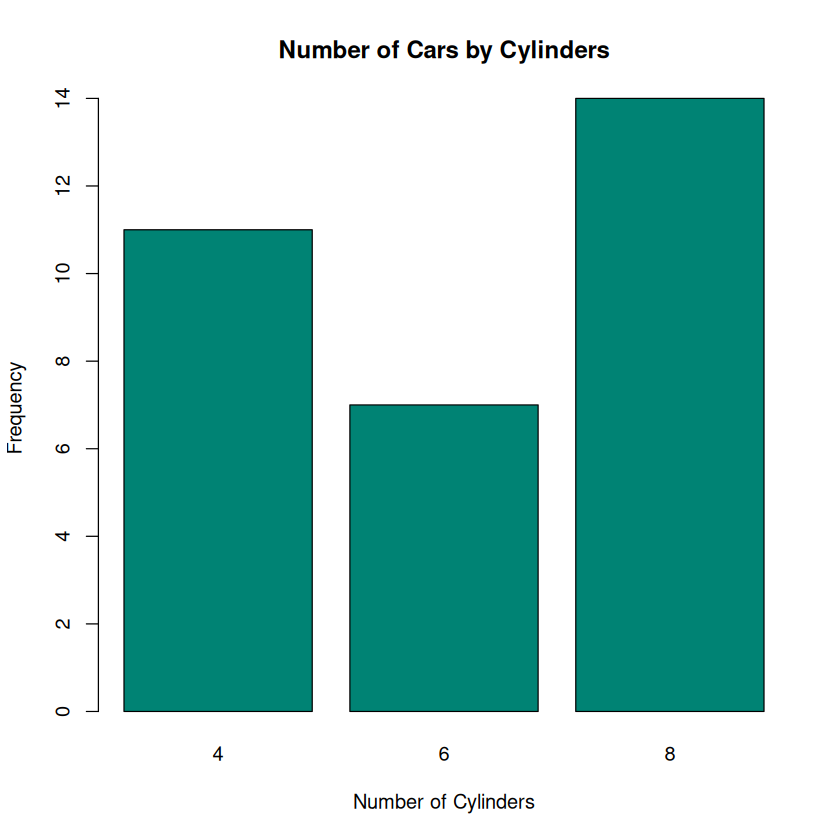 # Bar chart of the number of cars by number of cylinderscyl_counts <-table(mtcars$cyl)barplot(cyl_counts,main ="Number of Cars by Cylinders",xlab ="Number of Cylinders",ylab ="Frequency",col ="#008374")