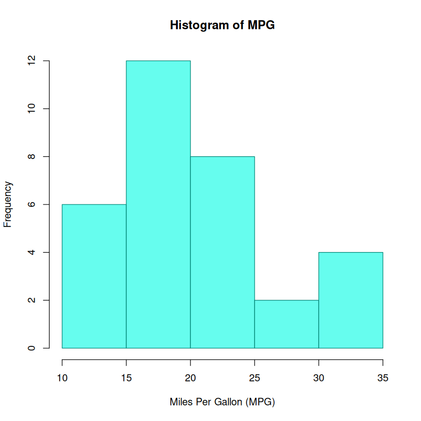 # Histogram of MPGhist(mtcars$mpg,main ="Histogram of MPG",xlab ="Miles Per Gallon (MPG)",col ="#66fdee",border ="#008374")