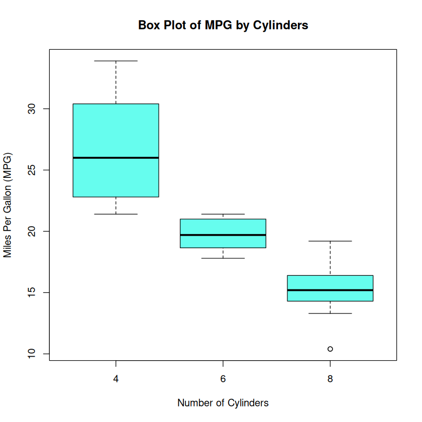 # Box plot of MPG by number of cylindersboxplot(mpg ~ cyl, data = mtcars,main ="Box Plot of MPG by Cylinders",xlab ="Number of Cylinders",ylab ="Miles Per Gallon (MPG)",col ="#66fdee")