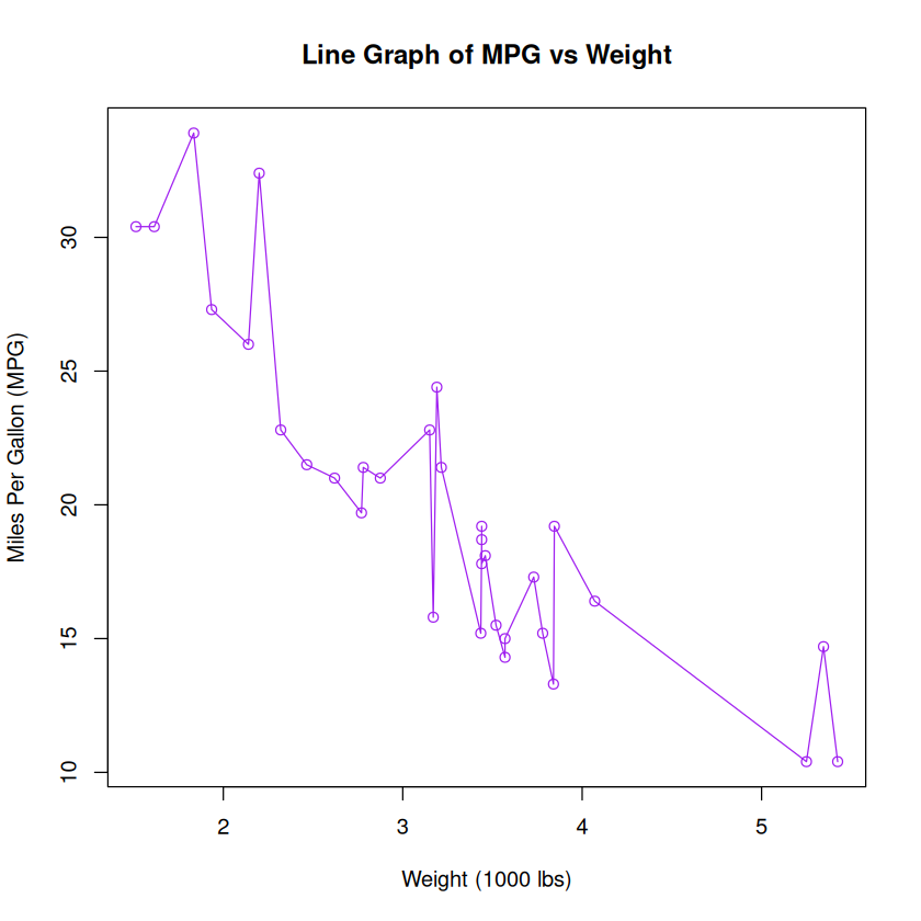 # Line graph of MPG for each car (ordered by weight)mtcars_ordered <- mtcars[order(mtcars$wt), ]plot(mtcars_ordered$wt, mtcars_ordered$mpg,type ="o", # Both lines and pointsmain ="Line Graph of MPG vs Weight",xlab ="Weight (1000 lbs)",ylab ="Miles Per Gallon (MPG)",col ="purple")
